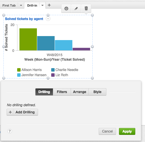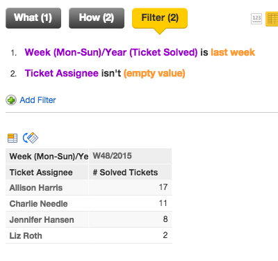 - Under the How panel select Ticket Assignee and Week(Mon-Sun/Year(Ticket Solved).
