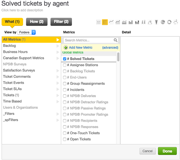 - Under the What panel, select the built-in metric # Solved Tickets.
