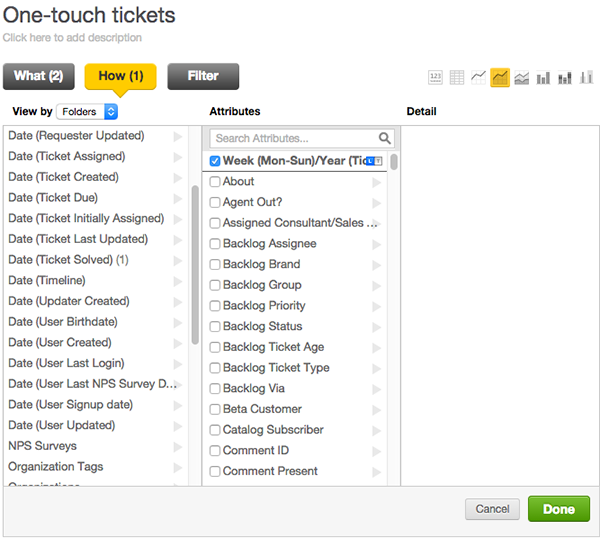 - In the How panel, select Week (Mon-Sun)/Year(Ticket Solved).