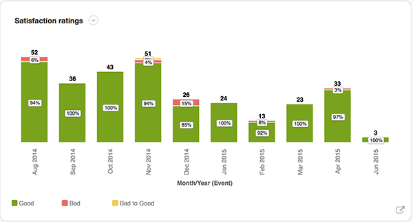 The satisfaction ratings graph displays good, bad, and bad to good ratings for each month in the selected period in a stacked bar graph.