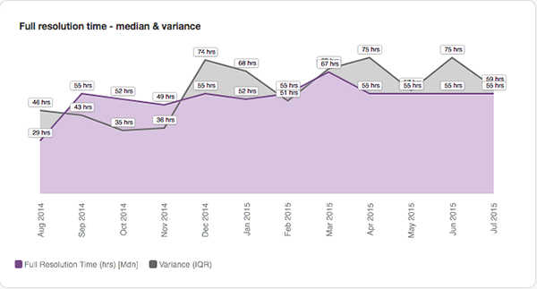 The full resolution time median and variance graph is useful for determining how spread out your resolution times are in comparison to the median. You can view the results of each individual day by selecting the month name, or you can view only the median or variance by hovering over the labels at the bottom of the graph.
