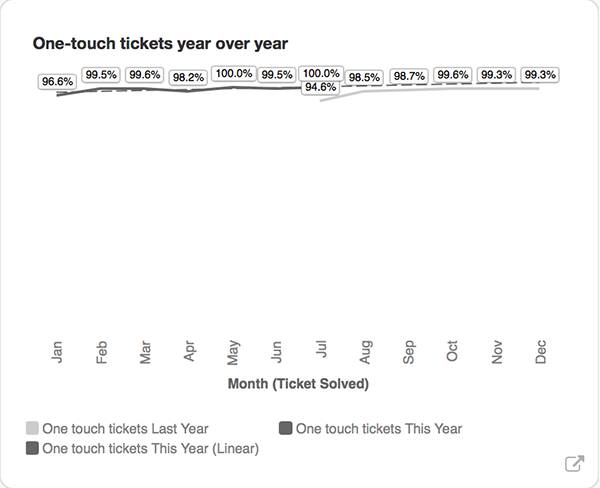 For each headline metric there is aYear-over-year graph that shows this year's and last's percentage of one-touch tickets, reassignments, or public comments per ticket last year.