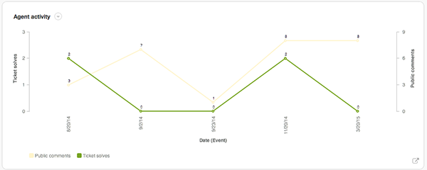 This chart is useful for comparing an agent's activity on weekly to yearly basis, as well as comparing the number of public comments to solved tickets.