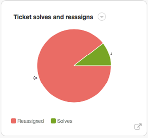 Ticket solves and reassigns pie chart displays a comparison of how many tickets the agent solved to how many tickets have been reassigned. You can view only one portion of the chart by hovering over the labels at the bottom of the chart.