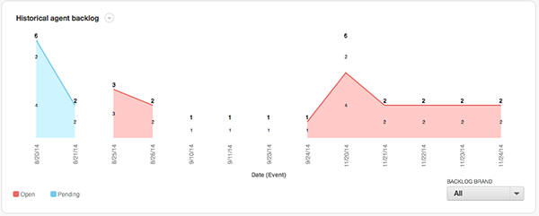 Historical agent backlog shows a snapshot of backlog tickets on each day in the selected time period. This information differs from the current backlog because it displays the agent's backlog over time. This graph is useful for comparing backlog productivity between previous and present months.