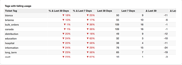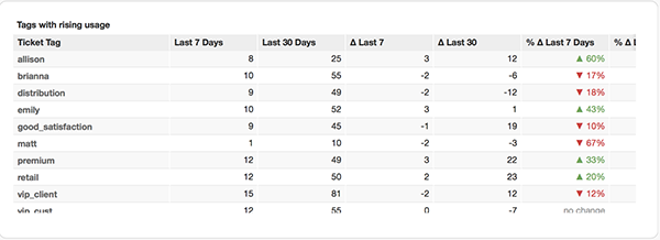 For each tag you can see the number of times the tag was used on tickets in the last 7 or 30 days. There is the net change and the percent change for the current 7 and 30 day reporting periods compared to the previous 7 and 30 days on each tag.