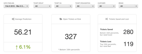 - Average Prediction shows the average Satisfaction Prediction Score on all tickets, as well as the percentage that score has changed.