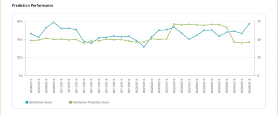 The prediction performance over time graph allows you to identify outliers when compared to your actual satisfaction score. This is especially powerful when combined with the dashboard filters to slice the report by different dimensions.