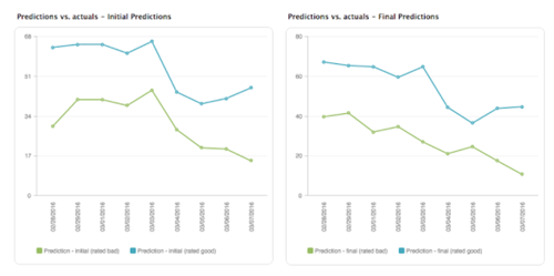 The prediction vs. actuals graphs show the initial predictions for tickets rated good and bad, and also the final predictions for tickets rated good and bad. You're able to see the difference in predictions and help identify the thresholds you could then use to create or refine triggers and automations.
