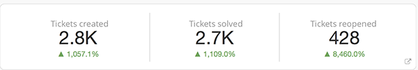 The Tickets tab contains headline metrics at the top of the page that display tickets created, solved, and reopened within the selected time period. Underneath each metric is the number of tickets created, solved, or reopened as a percentage of the tickets created, solved, or reopened during the previous time period (of the same duration).