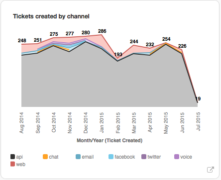 Tickets created by channel shows the number of tickets each channel generated in the selected month/year time range. This is useful for assessing which channel is collecting the majority of tickets and identifying any changes in channel intake.