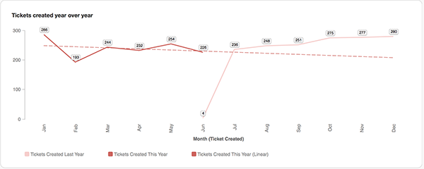 - How does my tickets solved/created compare to last year? These two graphs display a trend line demonstrating the decrease or increase in your tickets in comparison to the previous year. A rising trend line indicates your ticket created/solved rates are increasing, while a falling indicates the opposite.