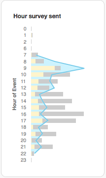 The hours survey sent graph compares the hour of the event versus the number of surveys offered, responded to, and the response rate. In this graph, the '0' hour indicates midnight. You can see the exact response number by hovering over the bar or by selecting View this report.