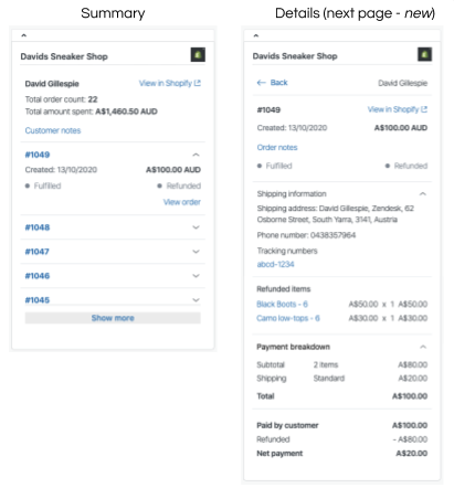 A redesigned Shopify app interface for Support and Chat to display additional customer and order details on a new page.