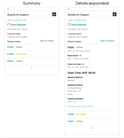 Customer profiles and a timeline of customer interaction events in Shopify can be viewed in Support’s customer context, such as actions performed to an order and during checkout. This feature is currently available in EAP. |