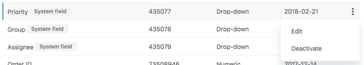 ) in the sidebar, then select Tickets > Fields. - Hover over the field you want to edit, then click the field options icon