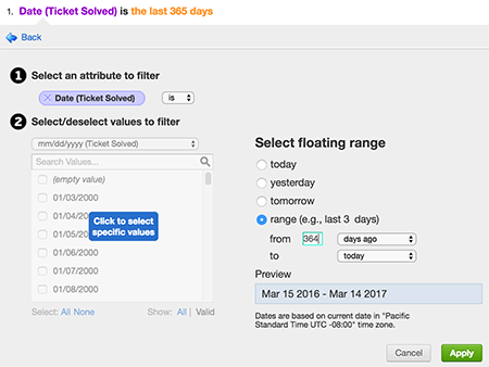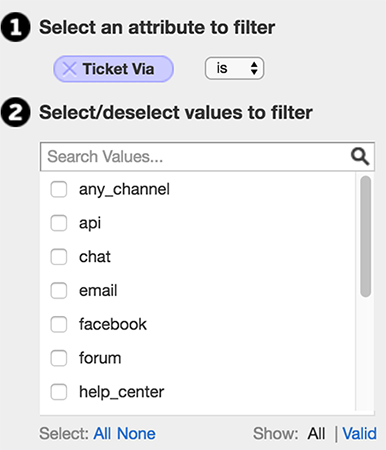 - Select the Ticket Via attribute containing the channel you want to measure.