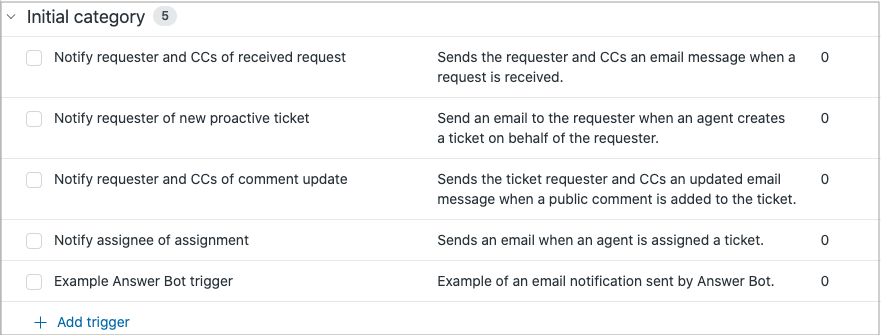 Trigger categories allow you to visually group triggers and make it easier for you to organize and manage your triggers. If your Support account was created before Jan 20, 2021, you may need to enable trigger categories first before you can use them. This article describes how admins can enable trigger categories.