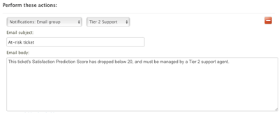 You can use the same criteria to create a trigger to send an email to Tier 2 Support agents, so they can intervene in the at-risk ticket. Similarly, you can create an automation to check for low scoring tickets periodically, and send the same email.