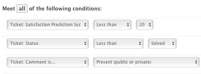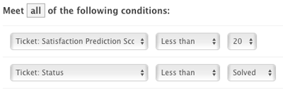 Let’s say you want to create a view for unsolved tickets with a Satisfaction Prediction Score below 20, so all at-risk tickets are in one place. You would use the Satisfaction Prediction Score as a condition when defining a new view.